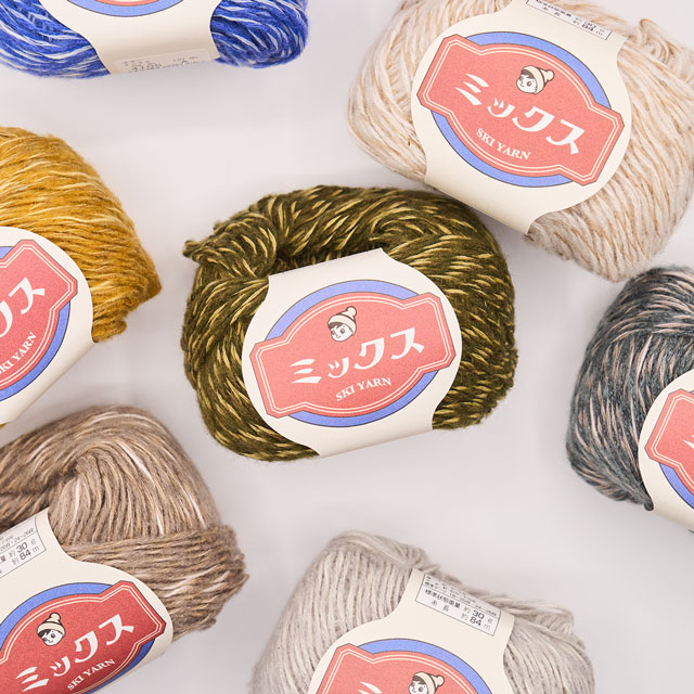 編むとそれぞれの糸の特徴によって絣調にも見え、また和柄のような色目と相まって、レトロなテイストが感じられる糸です。