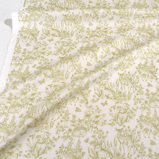 古典的なトワルドジュイのデザインの中に、うさぎやシカ、トイプードルなどのかわいい動物が描かれています。