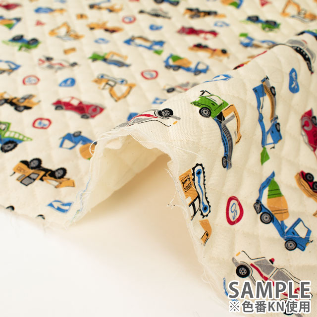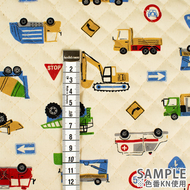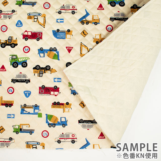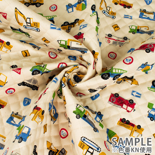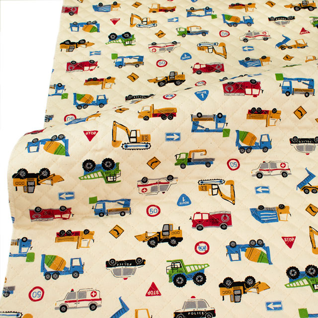 お子様に人気の「はたらく車」が勢ぞろいのにぎやかなプリント生地です。