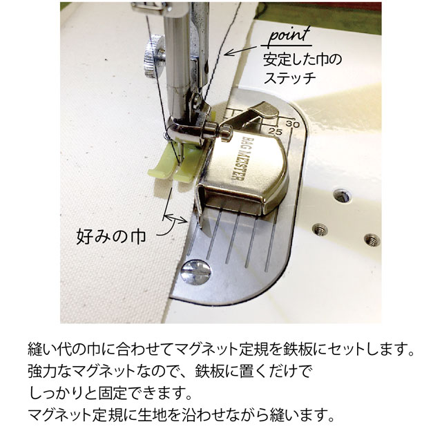 ミシンの鉄板に付けることで、生地を定規に沿わせながら安定した巾で縫うことができます。