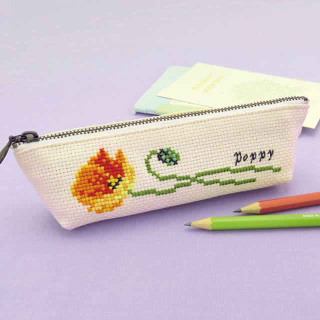 ワンポイントにクロスステッチを施した、ペンケースのキットです。