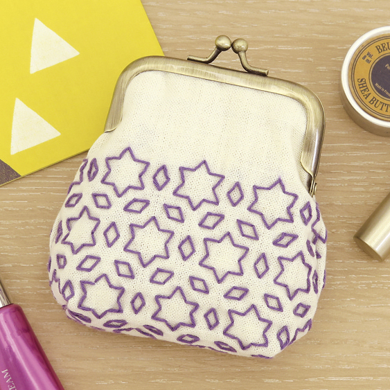- ●セット内容:No.4500刺し子布、裏布、刺し子糸、刺し子針、口金角型、紙ひも、指ぬき、作り方説明書