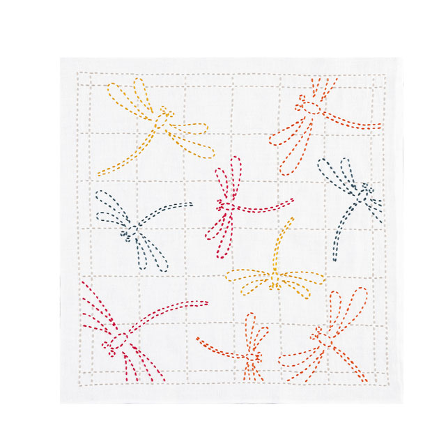 とんぼをモチーフにした初級者向けの刺し子花ふきんキット。