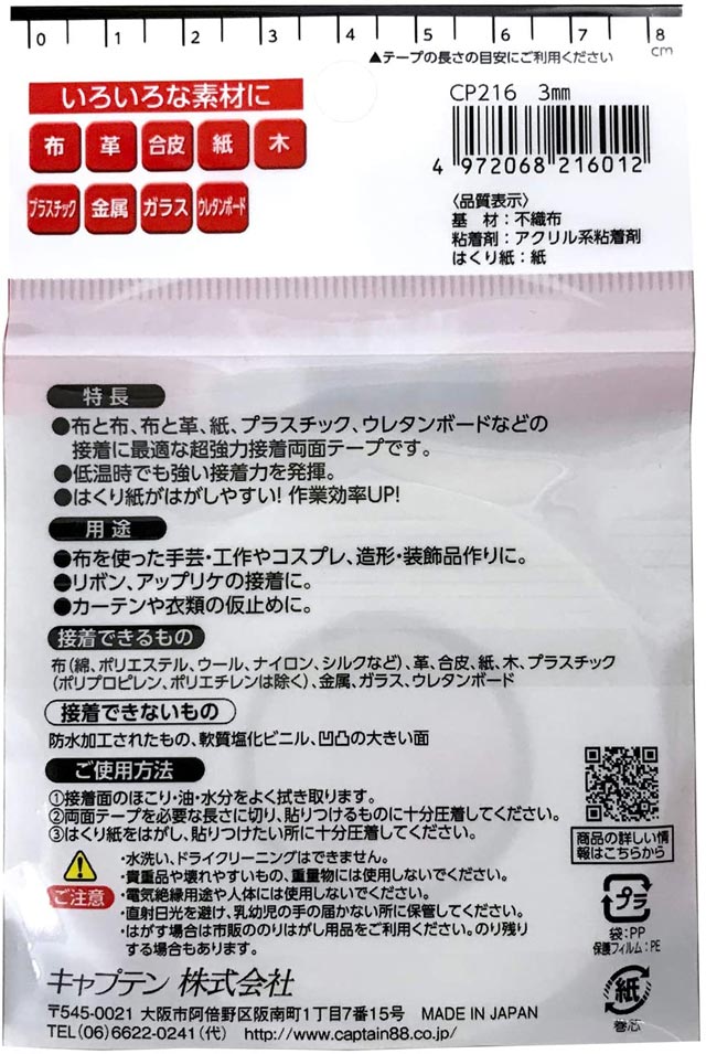 - ●素材:基材…不織布 / 粘着剤…アクリル系粘着剤 / はくり紙…紙