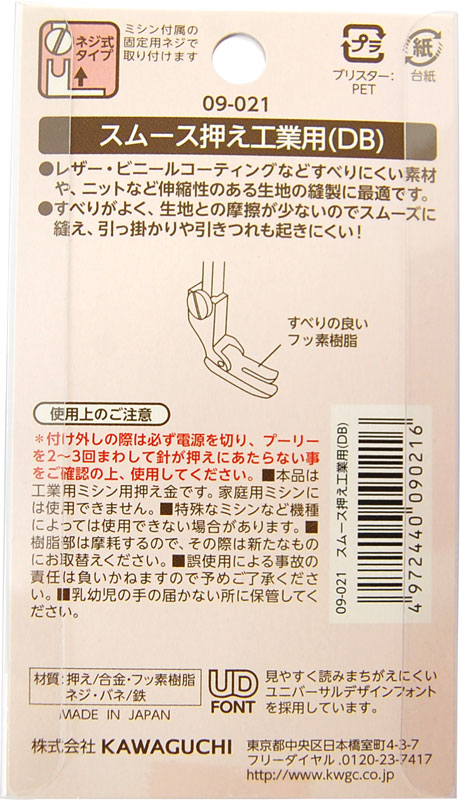 レザー・ビニールなど、すべりにくい素材や、ニットなど伸縮性のある生地の縫製に便利なミシン押えです。