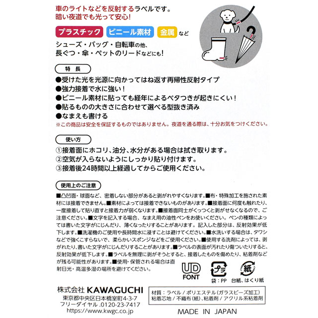 ●材質:ラベル/ポリエステル(ガラスビーズ加工)、粘着芯地/不織布(紙)、粘着剤/アクリル系粘着剤