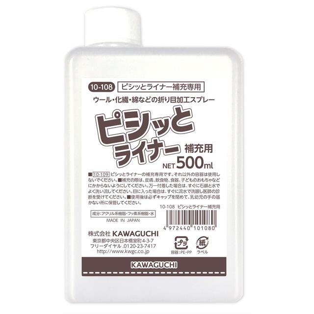 ウール、化繊、綿などの折り目加工スプレー「ピシッとライナー」の補充タイプ。