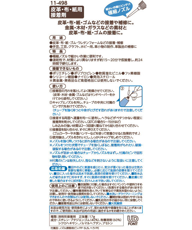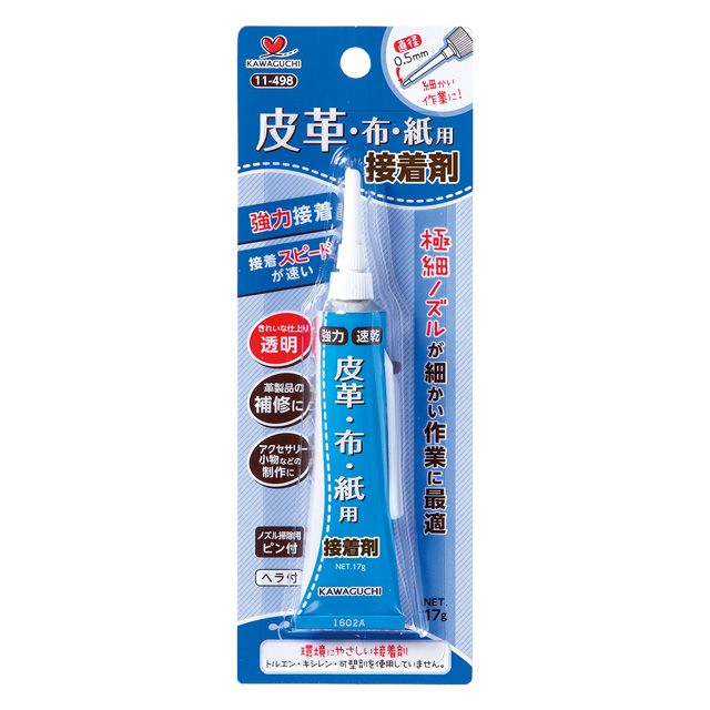 金属、木材、ガラスなどの素材と皮革、布、紙、ゴムの接着に適した接着剤です。
