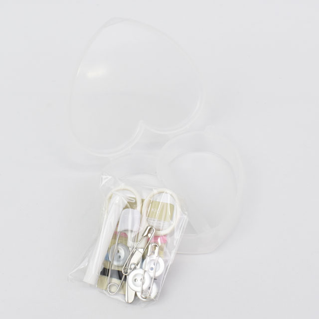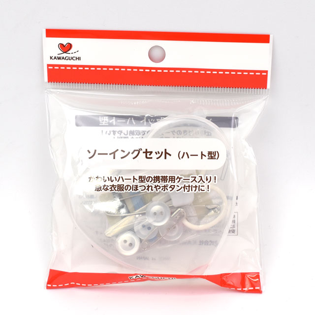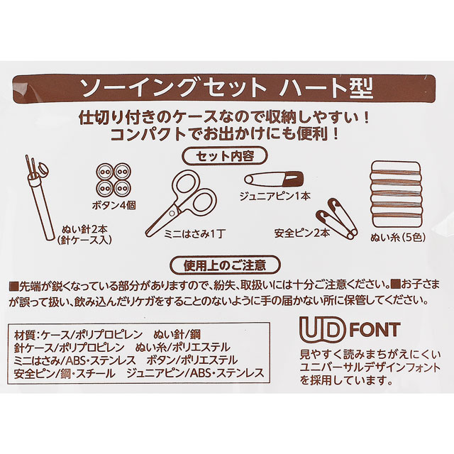 ●セット内容:ハート型ミニケース、縫い針2本(針ケース入り)、ミニはさみ1丁、ボタン4個(約11mm)、ジュニアピン1本、安全ピン2本、縫い糸5色
