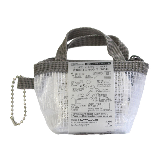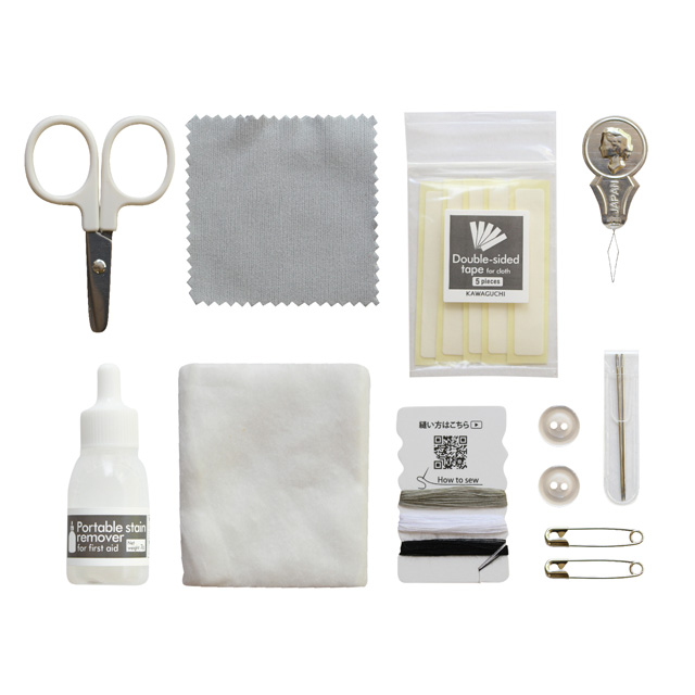 ●中身:縫い針2本(ケース付)、縫い糸(縫い方動画付き)、糸通し、ボタン2個、安全ピン2個、ミニはさみ、シミ・キエール&コットンパフ2枚(洋服についたシミをすばやく手当)、布用両面テープ、メガネ・スマホ拭きクロス