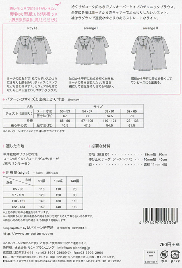 - ●型紙内容:こども(身長85~133cm、胸まわり50~65cm)用のヨークチュニックブラウス