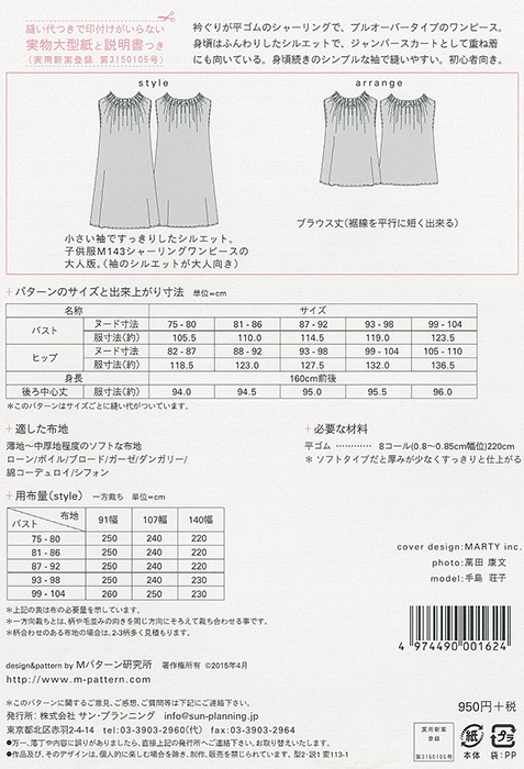 - ●型紙内容:大人(身長160cm前後、バスト75~104cm)用のシャーリングワンピース