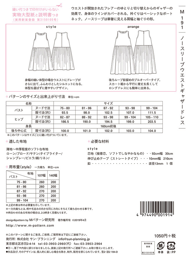 - ●型紙内容:大人(身長160cm前後、バスト75~104cm)用のノースリーブウエストギャザードレス