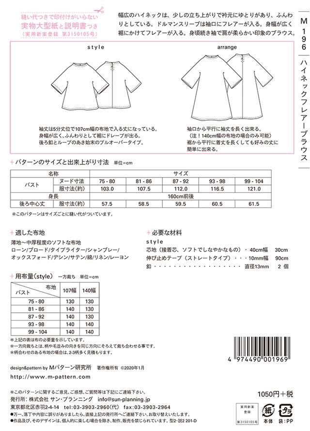- ●型紙内容:大人(身長160cm前後、バスト75~104cm)用のハイネックフレアーブラウス