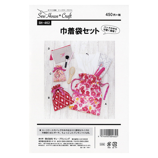 巾着袋3種とポーチが作れる縫い代つき実物大型紙です。