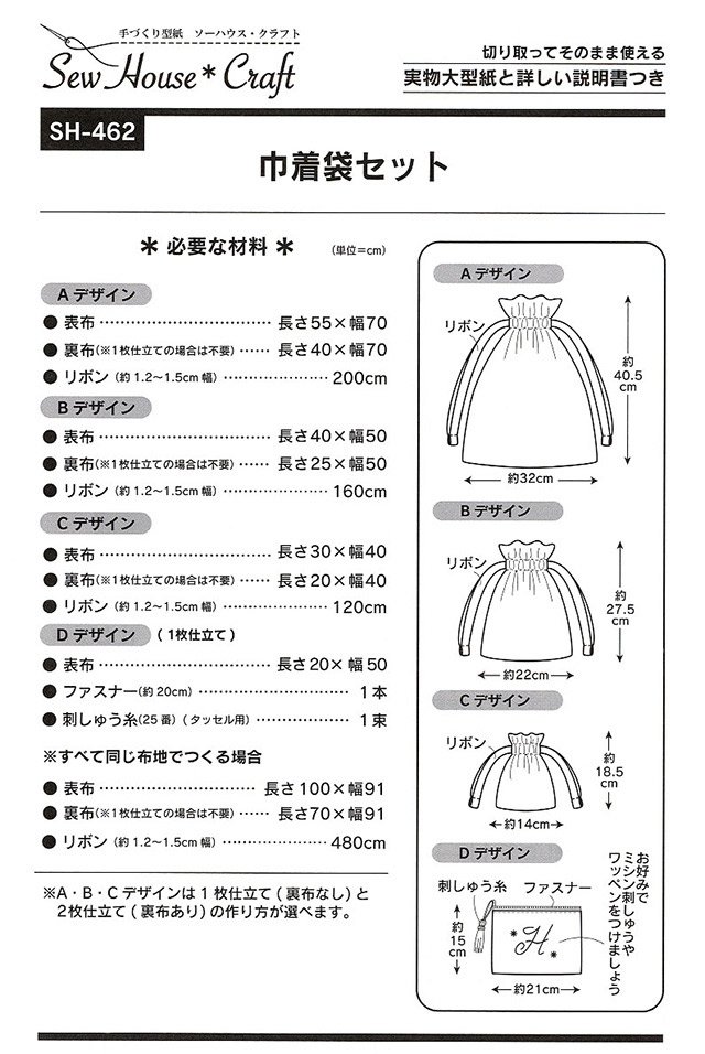 - ●型紙内容:巾着A(約40.5cm×約32cm)、巾着B(約27.5cm×約22cm)、巾着C(約18.5cm×約14cm)、ポーチD(約15cm×約21cm)