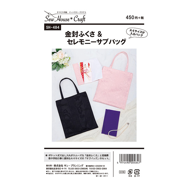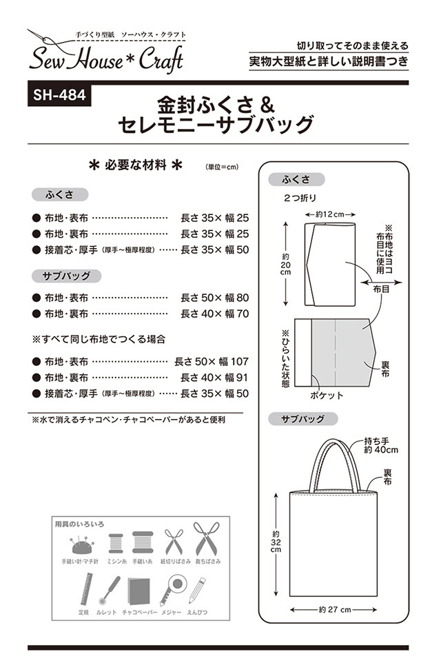 - ●型紙内容:金封ふくさ(閉じた時:タテ約20cm×ヨコ約12cm)、セレモニーサブバッグ(タテ約32cm×ヨコ約27cm)