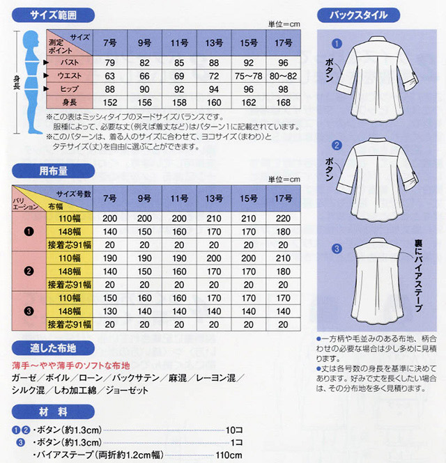 ●おすすめの布地:薄手~やや薄手のソフトな布地。(ガーゼ/ローン/ボイル/バックサテン/麻混/レーヨン混/シルク混/しわ加工綿/ジョーゼットなど)