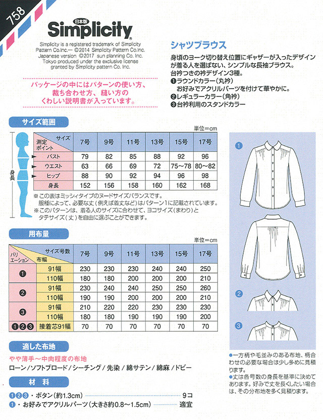 - ●型紙内容:大人(7~17号)用のシャツブラウス