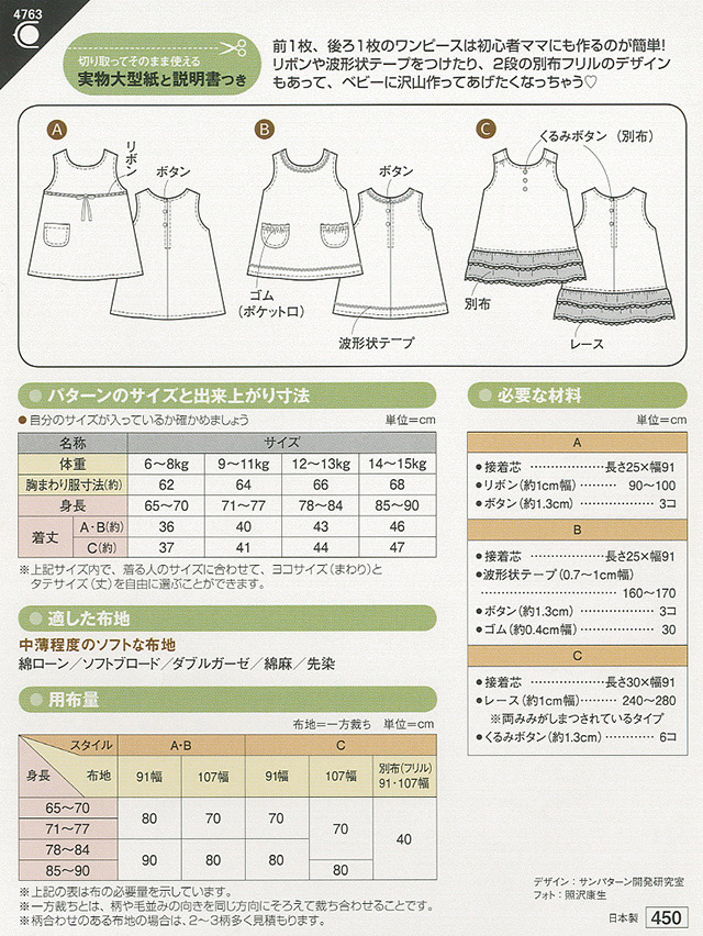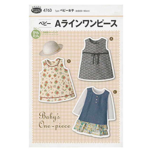 - ●型紙内容:ベビー(身長65cm~90cm)用のAラインワンピース3種