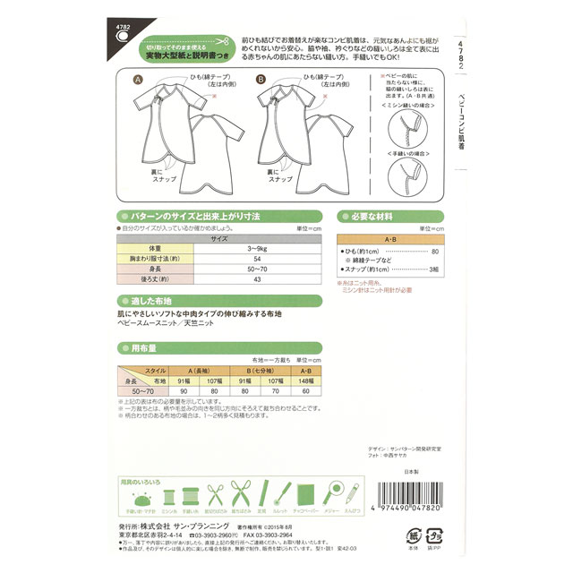- ●型紙内容:ベビー男女(身長50~70cm)用のコンビ肌着
