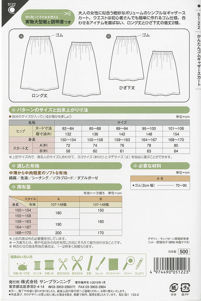 - ●型紙内容:大人用のギャザースカート (対応サイズは画像をご確認ください。)