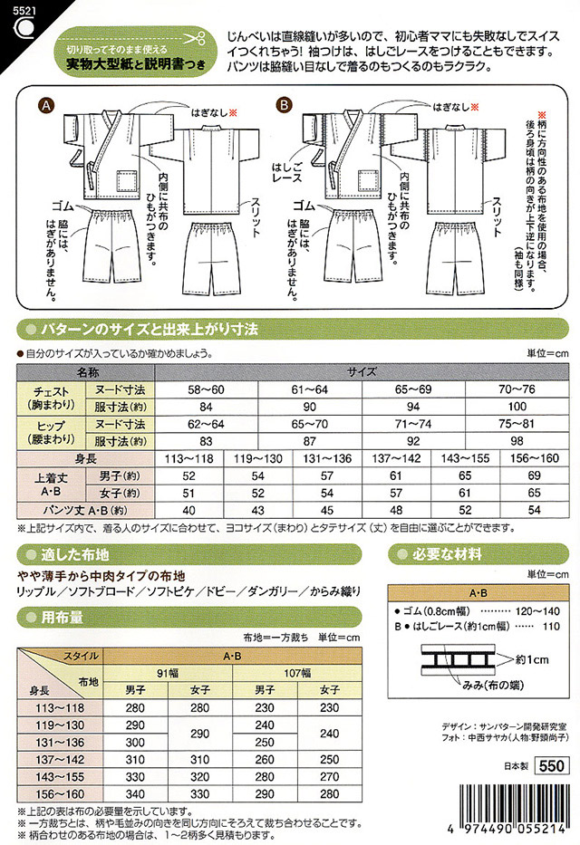 - ●型紙内容:こども(身長113cm~160cm)用のじんべい