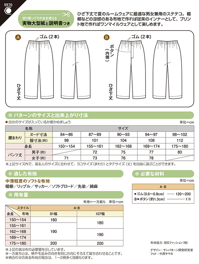 - ●型紙内容:大人用のステテコ ※男女用(対応サイズは画像をご確認ください。)