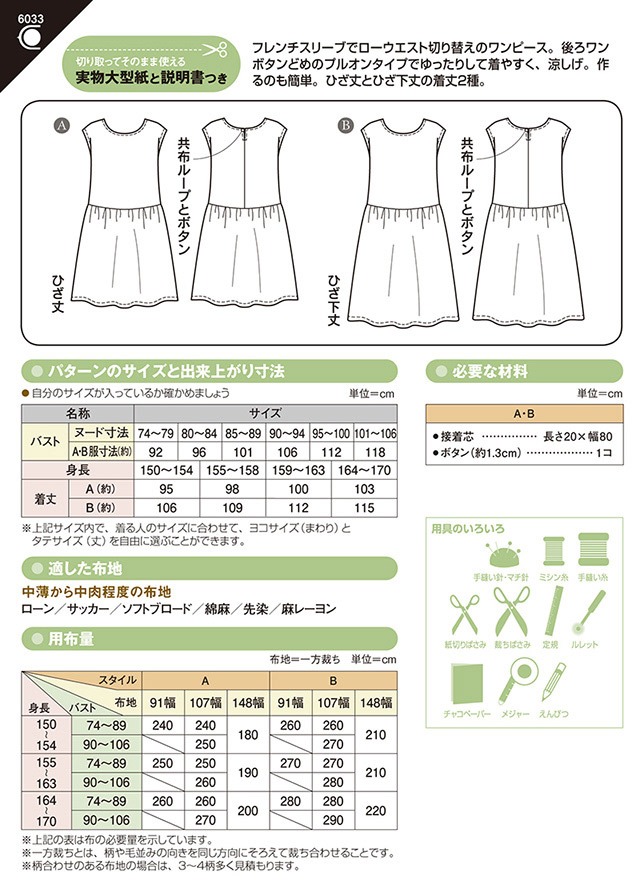 - ●型紙内容:大人用のローウエストワンピース(対応サイズは画像をご確認ください。)