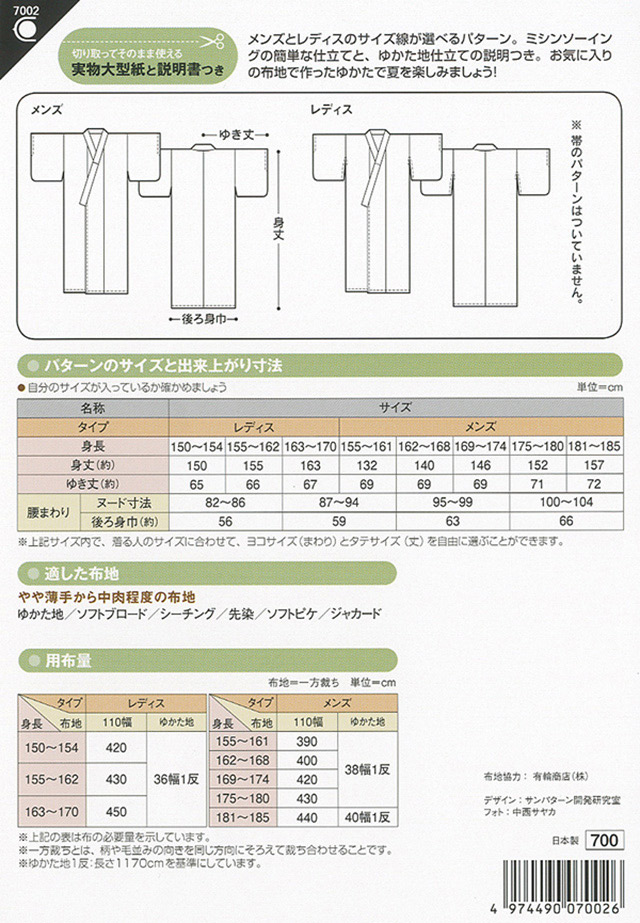 - ●型紙内容:大人用のゆかた ※男女用(対応サイズは画像をご確認ください。)