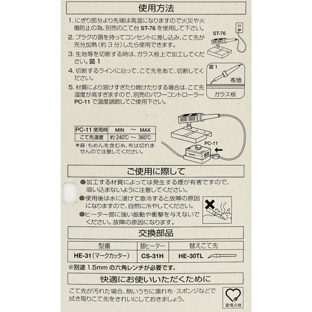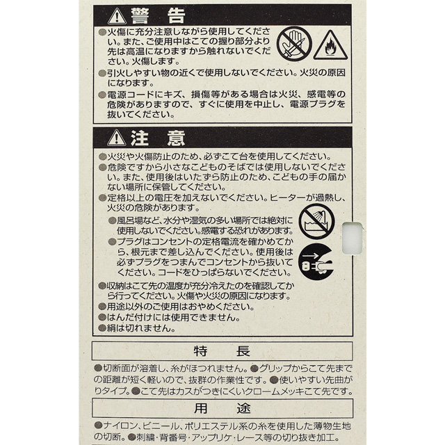 絹・綿・麻・金属繊維など、熱で溶けない生地は切断できません。はんだ付けには使用できません。