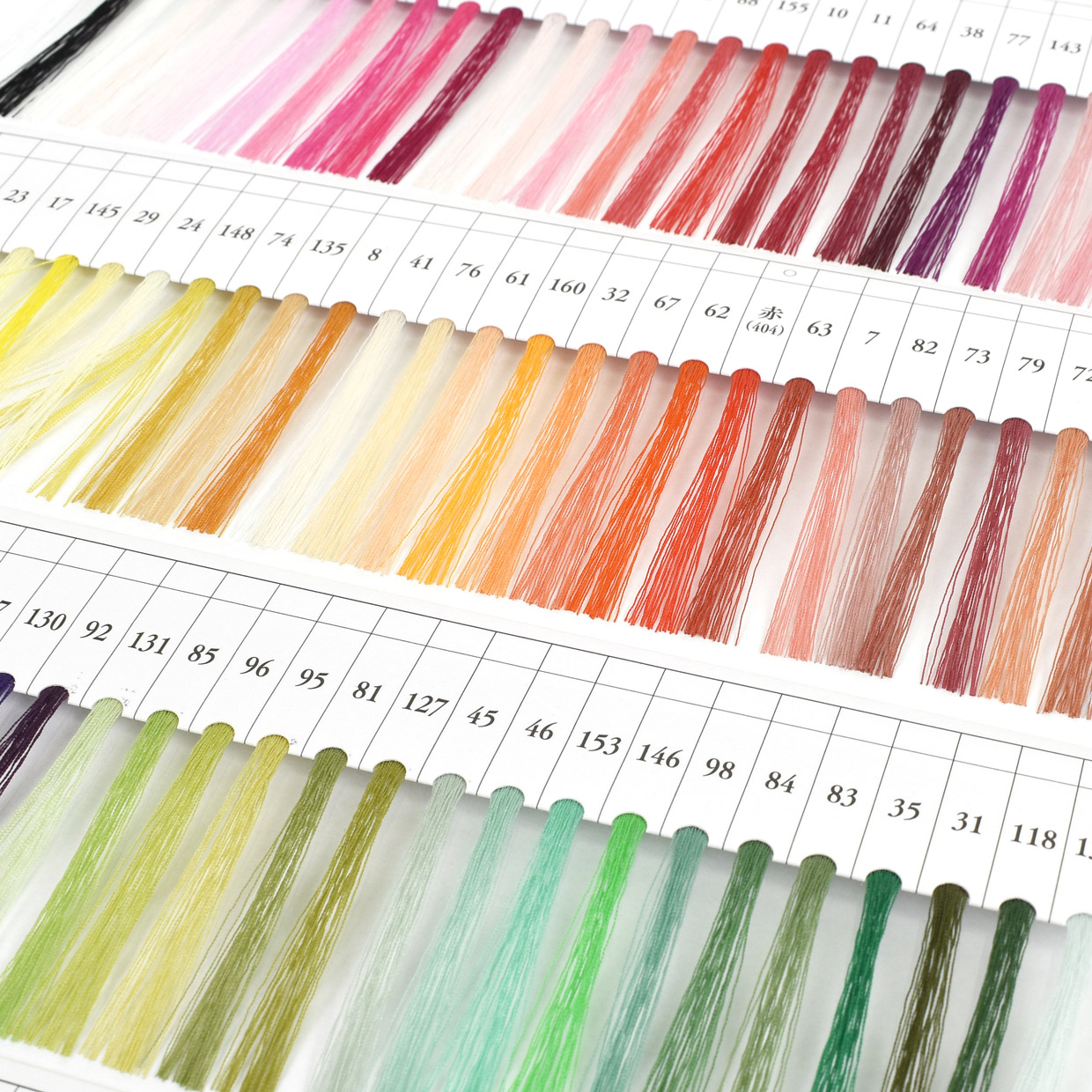 実物の糸束がついた見本帳なので、お手持ちの布地に合わせて糸を選ぶ際に役立ちます。