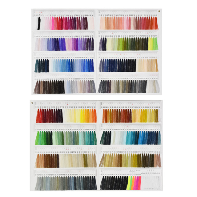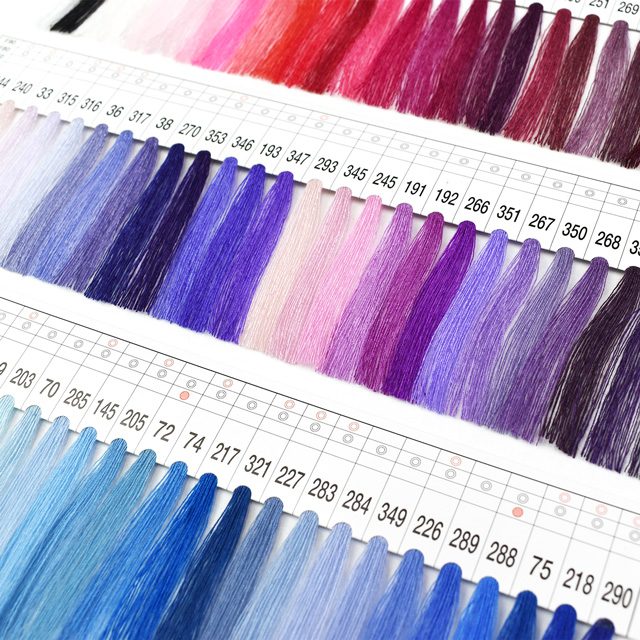 実物の糸束がついた見本帳なので、お手持ちの布地に合わせて糸を選ぶ際に役立ちます。