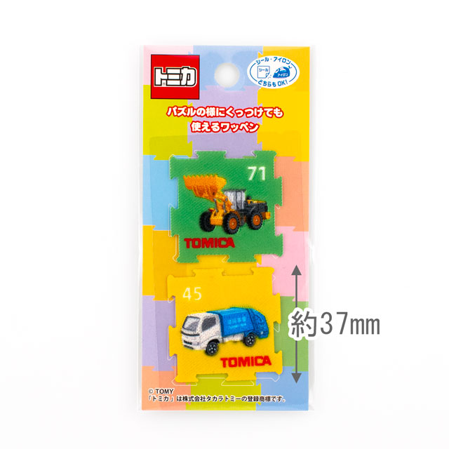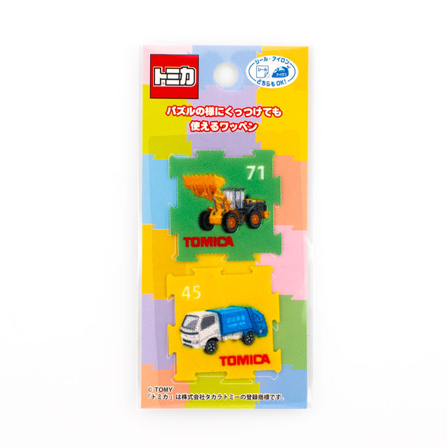 パズルの様にくっつけても使える、トミカ(ホイールローダ・清掃車)の2個付きワッペンです。