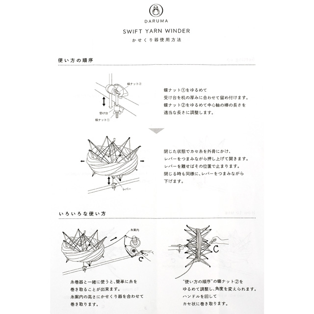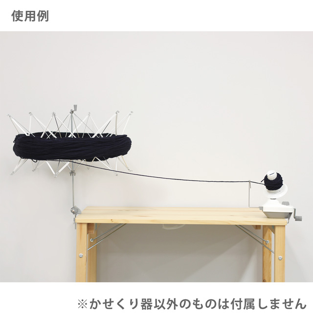 かせ糸を玉に巻くのはもちろん、玉に巻いてある糸を、上部のハンドルを回してカセ状に巻きとるのにも便利です。