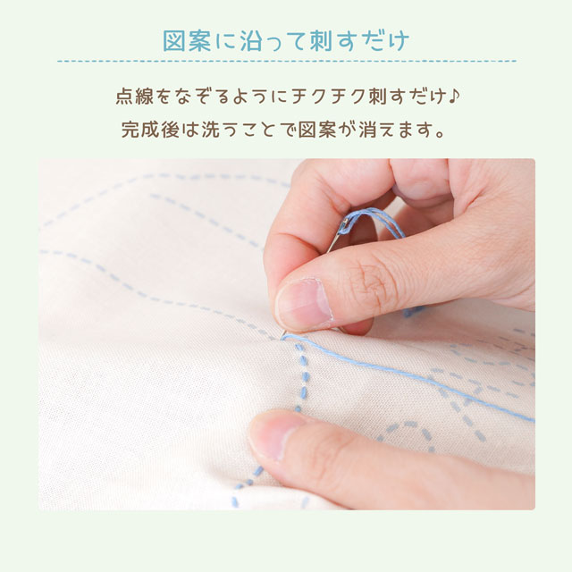 水で消えるプリントで図案を印刷してあるので、線に沿ってステッチをしていくだけでかわいいふきんが仕上がります。