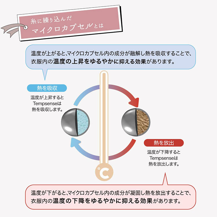 糸に練り込まれたマイクロカプセルが、 衣類内温度変化をやわらげる※TempSense®