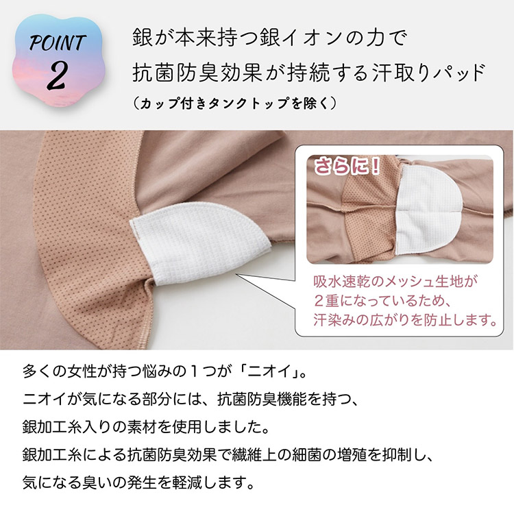 抗菌防臭汗取りパッド(銀イオン)、汗じみ防止メッシュ付。