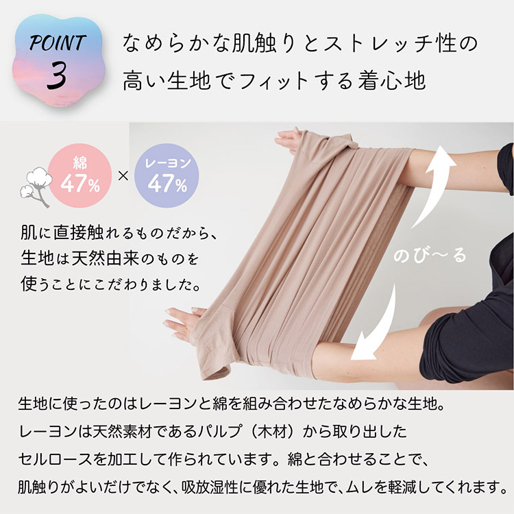 なめらか生地は 吸放湿性に優れ、ムレを軽減。