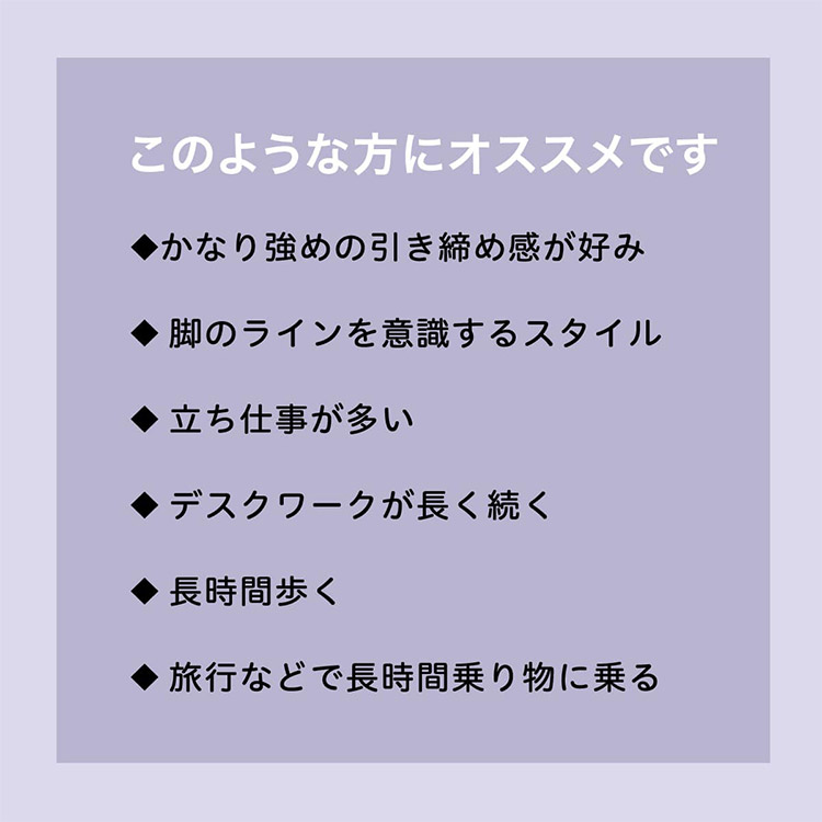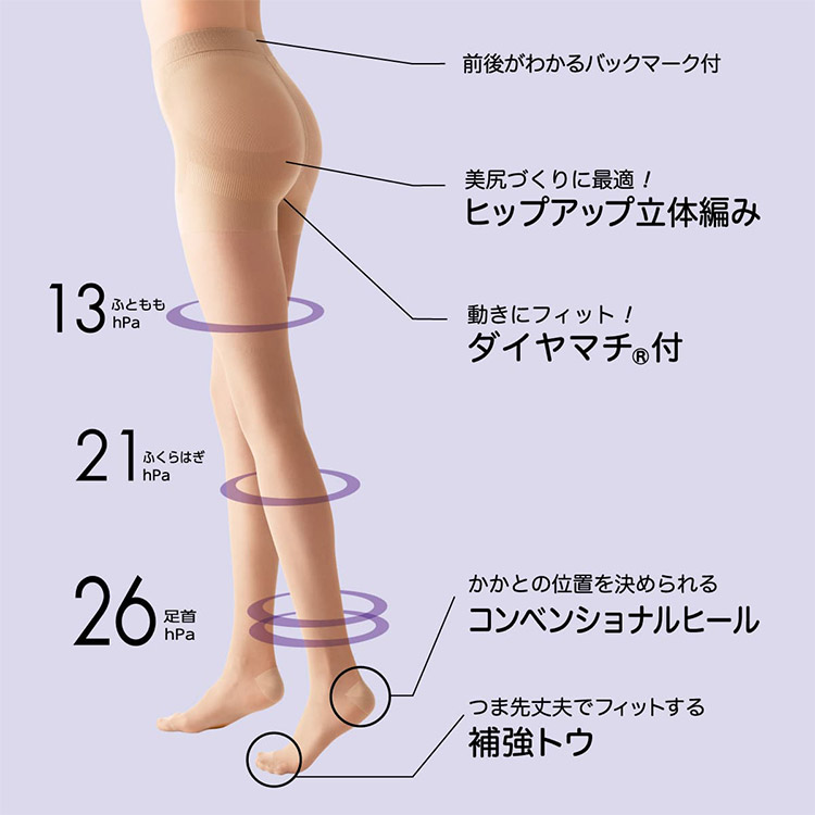 太ももから足首の着圧値を段階的に設計することで各部位を適切な強さで引き締め、レッグラインを美しく見せます。