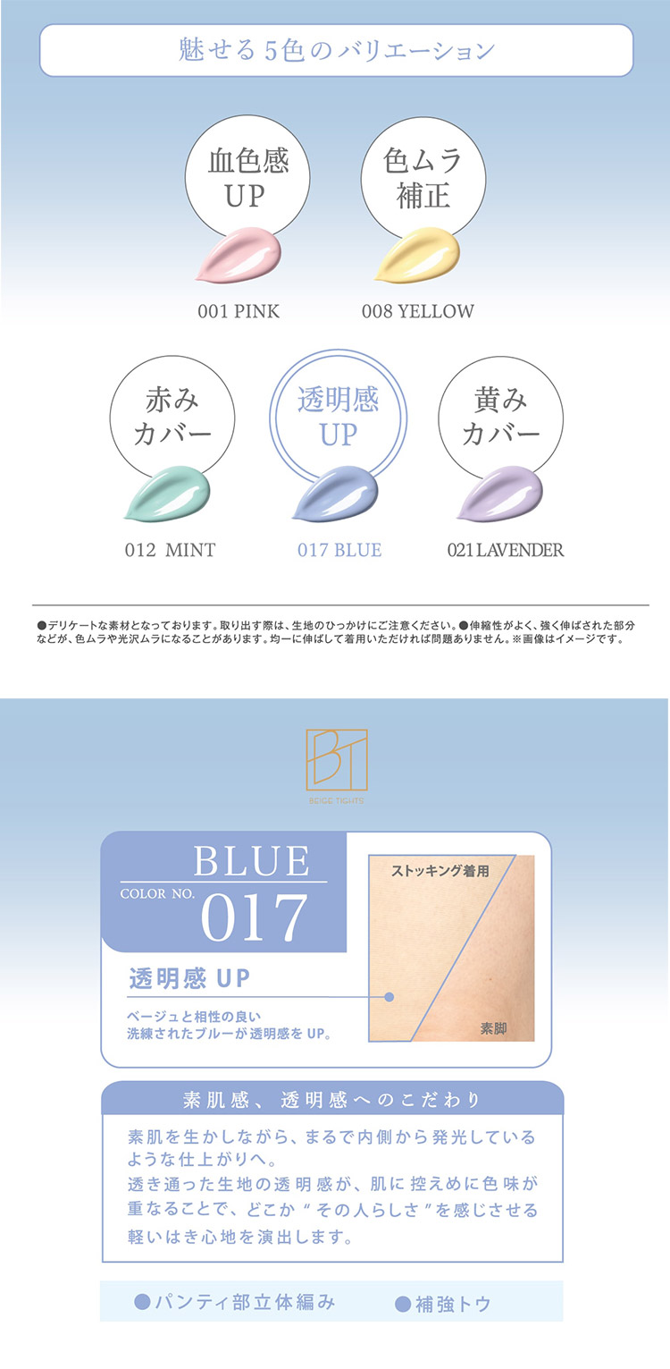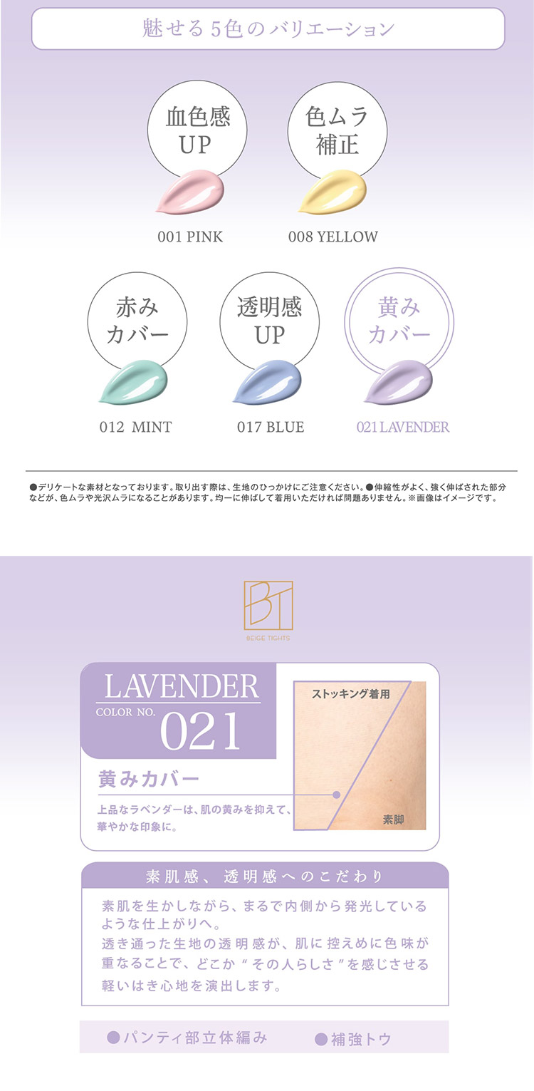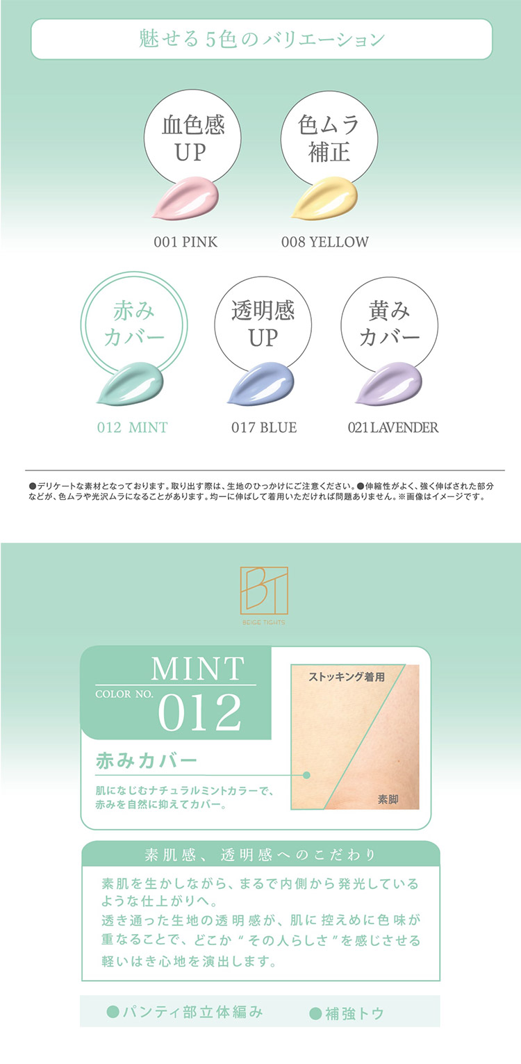 色の補色性質を利用して肌の色味を補正し、なりたい肌へ導くコントロールカラーストッキング。