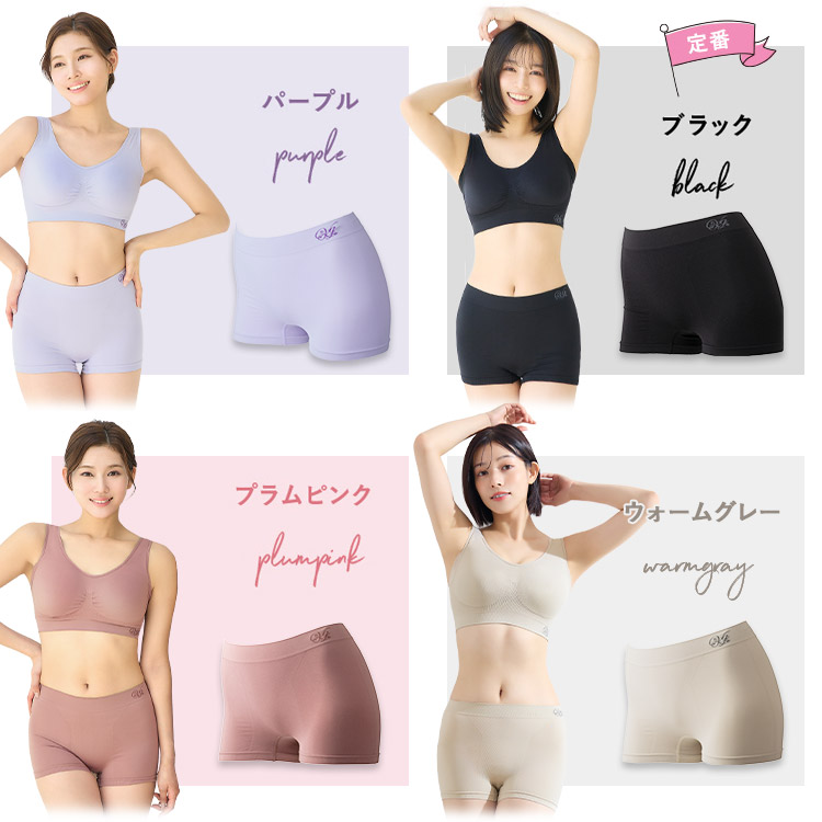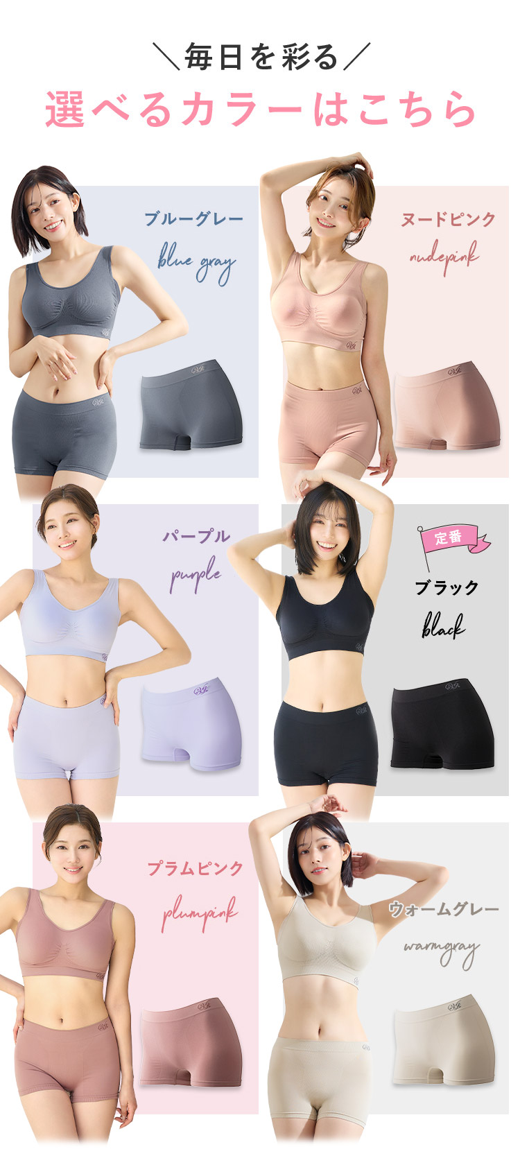 ウォームグレー、ヌードピンク、パープル、ブラック、プラムピンク、ブルーグレー
