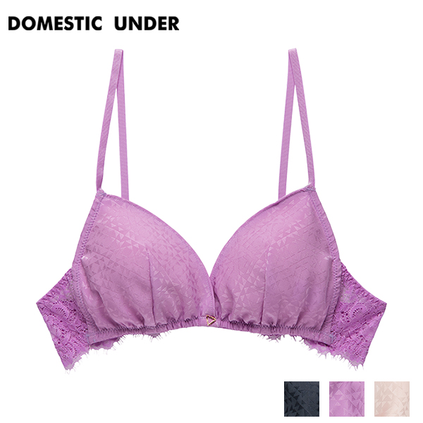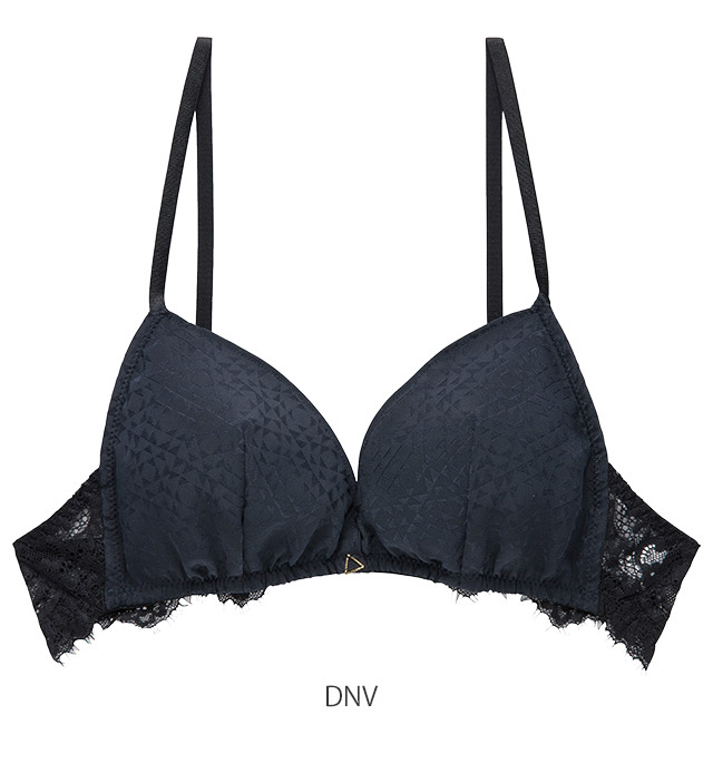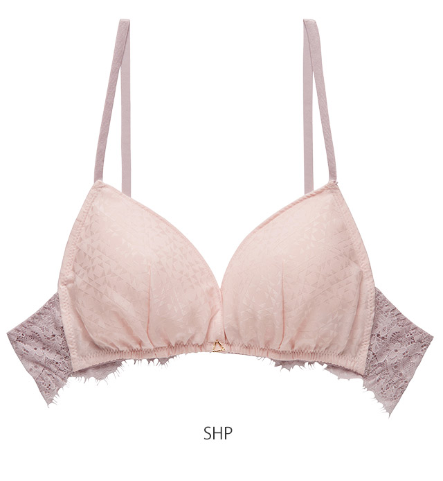 肌ざわりの良いパウダーなサテン。幾何柄のジャガードにフェミニンなアイラッシュレースを配色した、モダンなランジェリーです。 きらめくトライアングルチャームがキュートなアクセントに。 カップにサテンジャガード、バックにストレッチアイラッシュレースを配したソフトブラ。 可愛さだけでなく、着心地も優秀です。