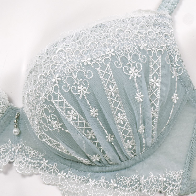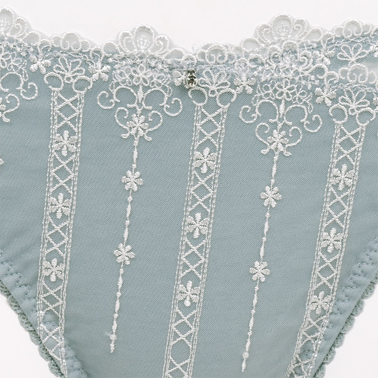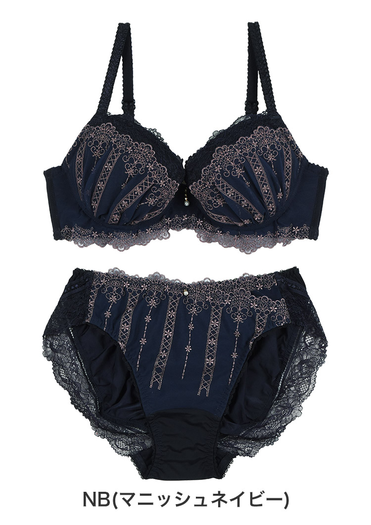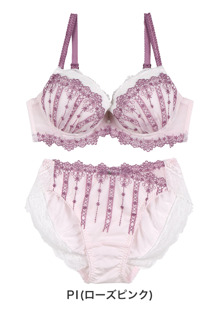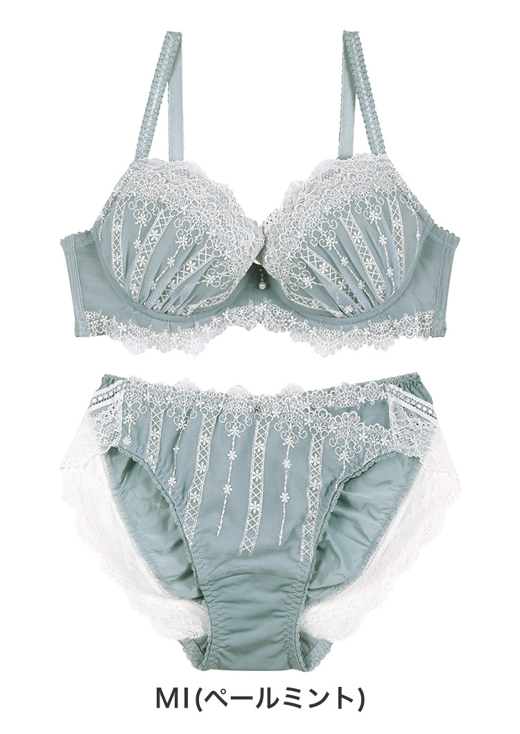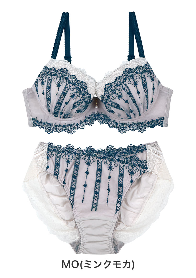 フェミニンかつ上品な編み上げドレスをイメージし、チュールレースに編み上げデザインを、カップ土台にはドレスのフリル感をイメージしたレース使い。