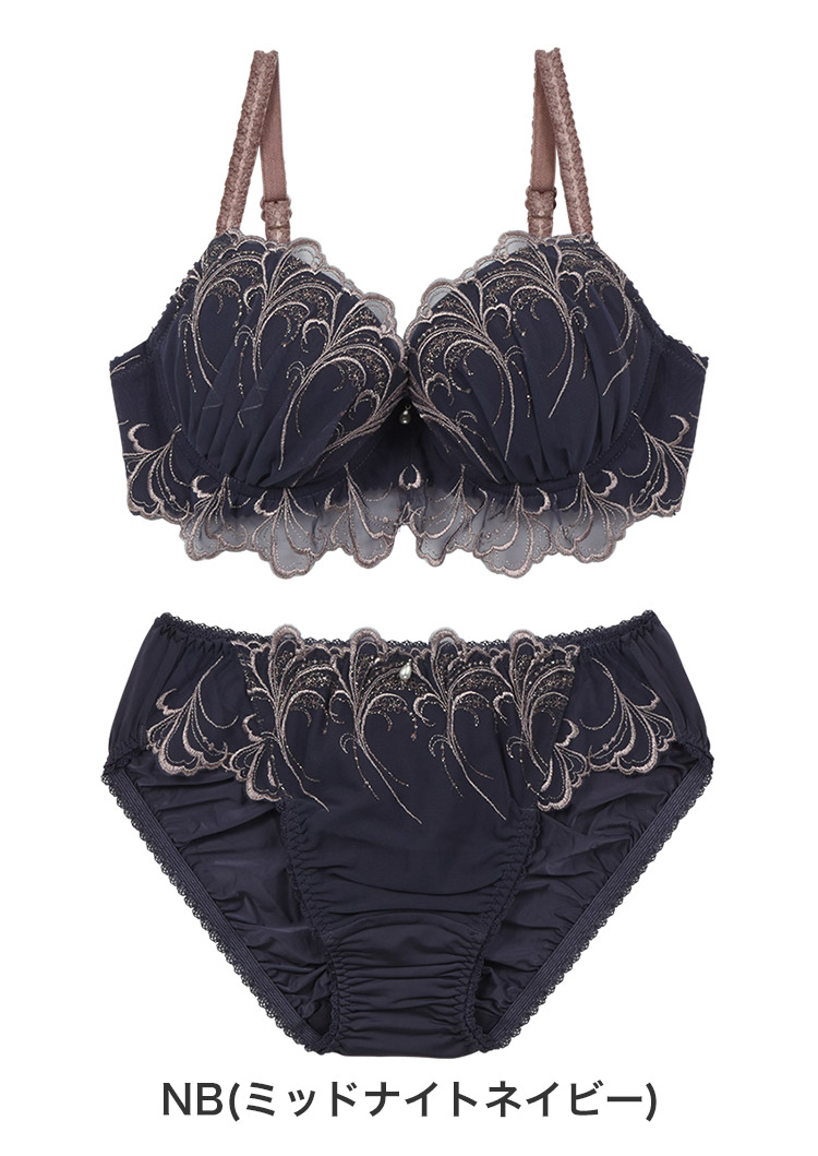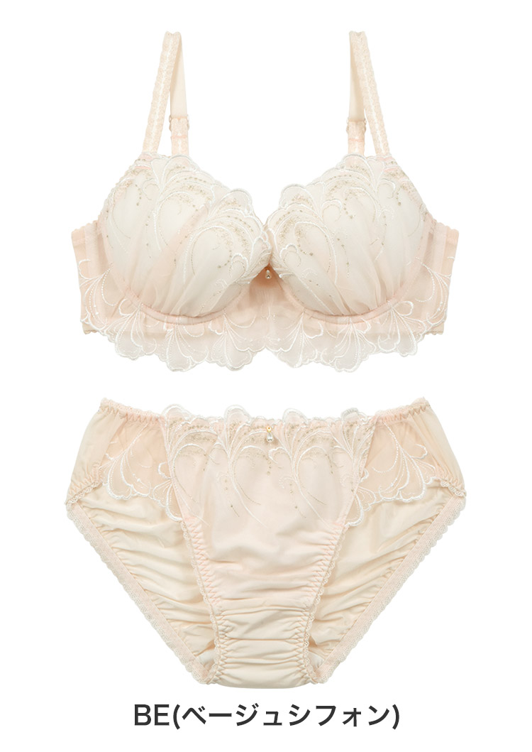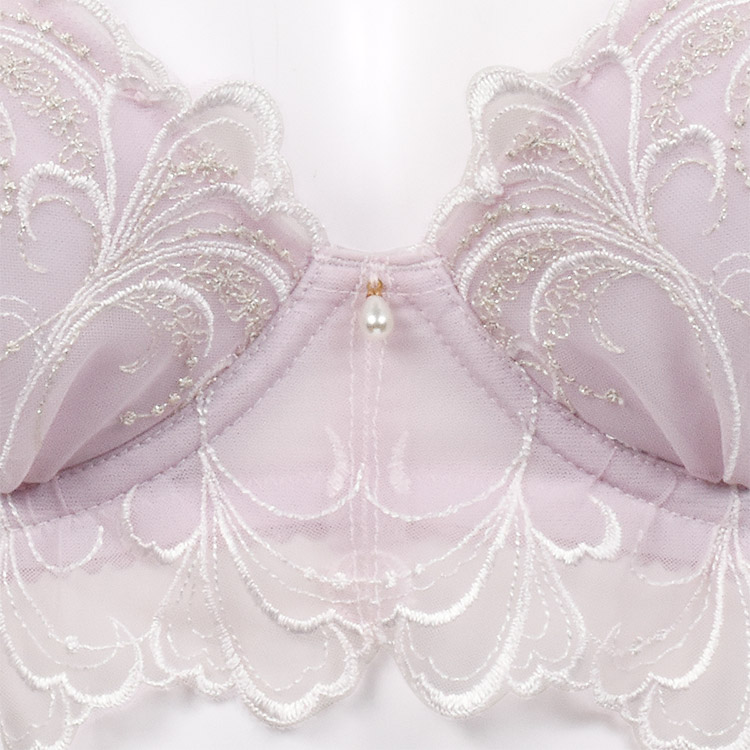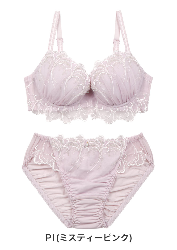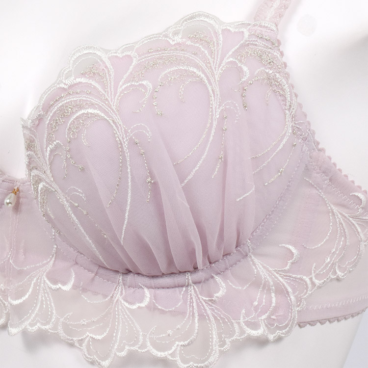 カップ表は流れるような刺繍がふんわりと柔らかい印象のギャザー仕上げ。