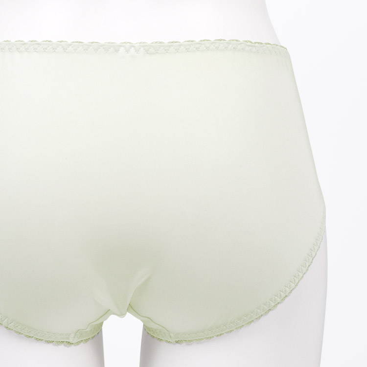 フィット感を高めるために足ぐりゴム使用。ヒップをしっかりとつつむパターンで食いこみ、ズレあがり防止。シルエットをすっきりとした印象に。