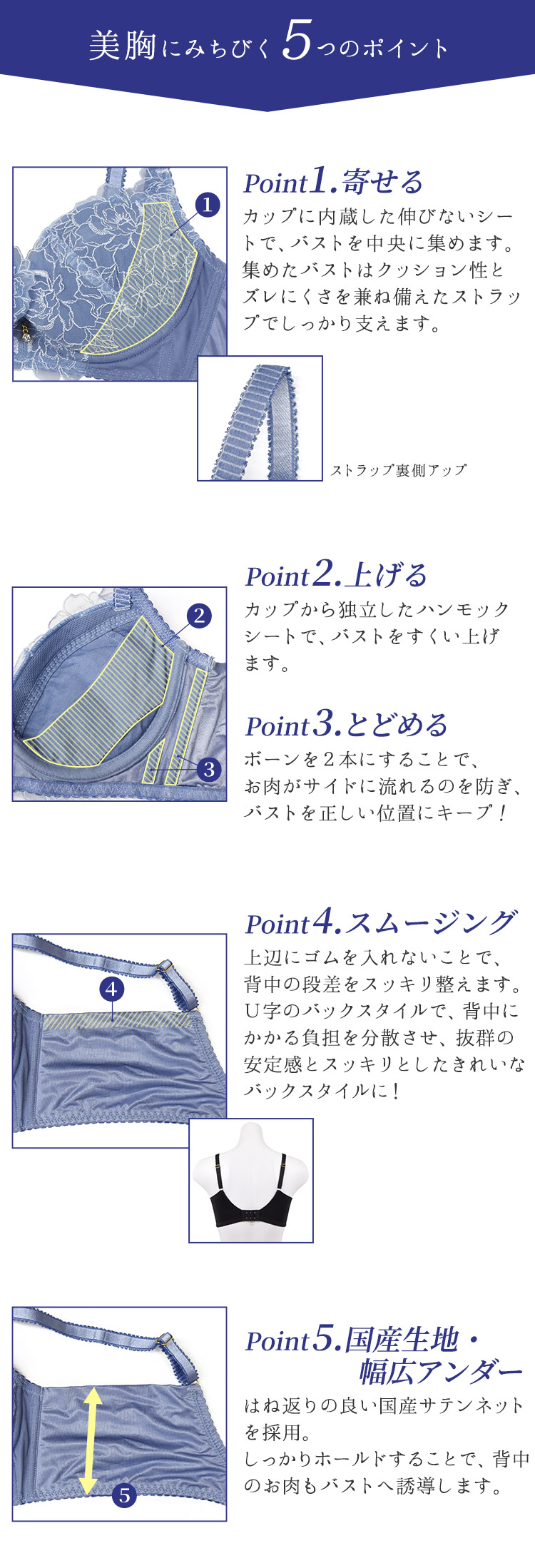 跳ね返りの良い国産サテンネットを使用し、脇に流れがちなお肉を前に持ってきてしっかり補整。