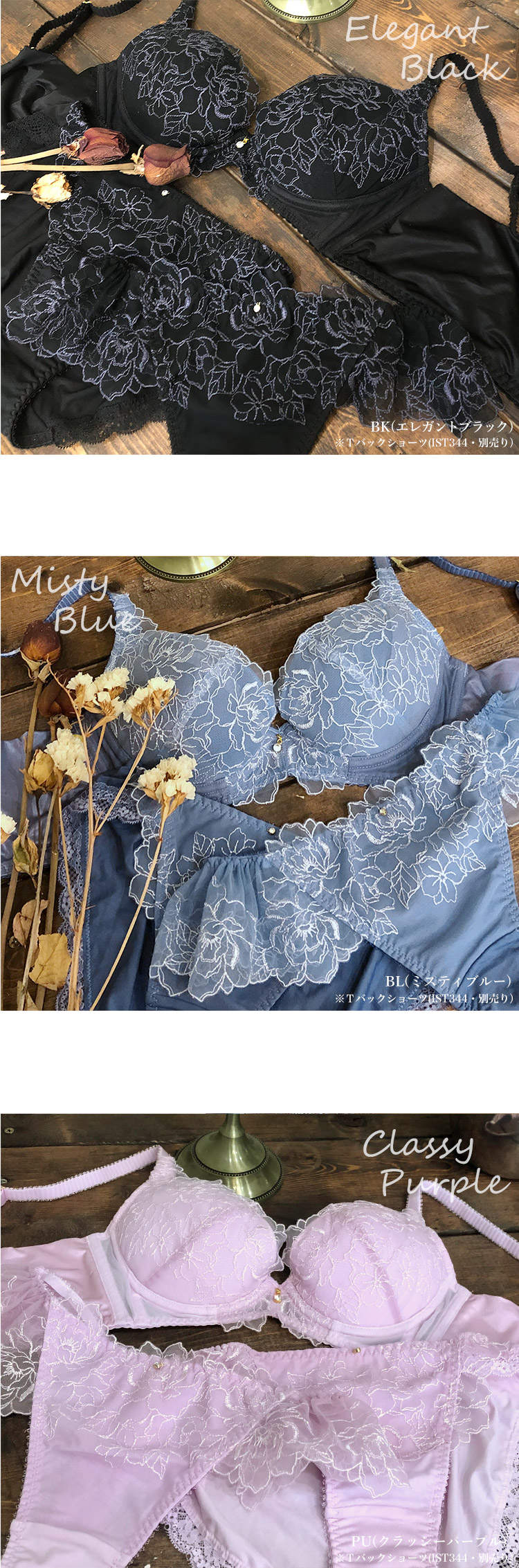 BK(エレガントブラック)、BL(ミスティブルー)、PU(クラッシーパープル)
