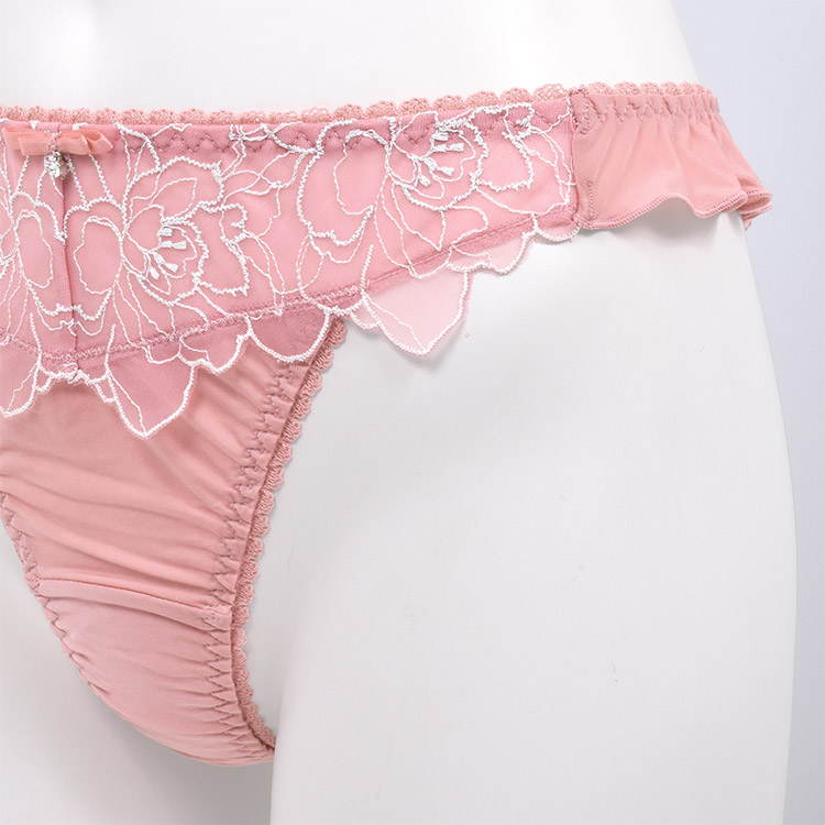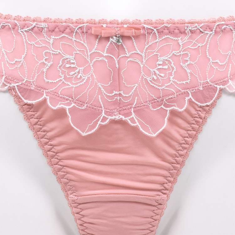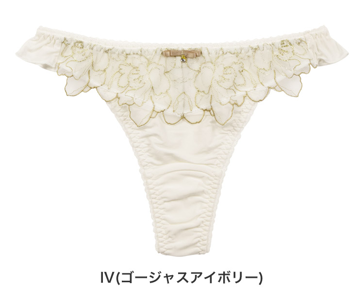 スカラップを下向きに配して、ウエスト周りを華やかに引き立てるデザイン。