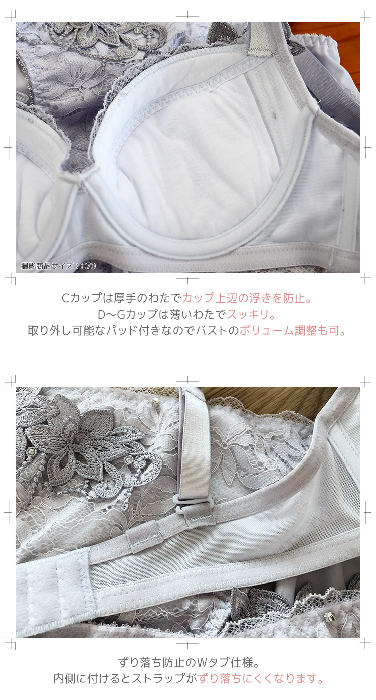 Cカップは厚手のわたでボリュームUPと上辺の浮きを防止、D~Gカップは薄手のわたですっきり。脇流れ防止の千鳥ステッチ入り。